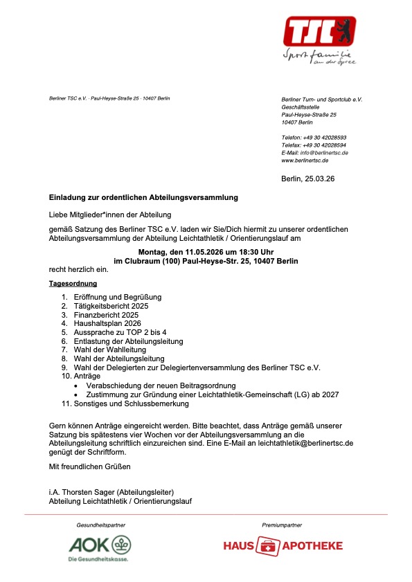 Einladung zur ordentlichen Abteilungsversammlung Leichtathletik/Orientierungslauf am 11.05.2026