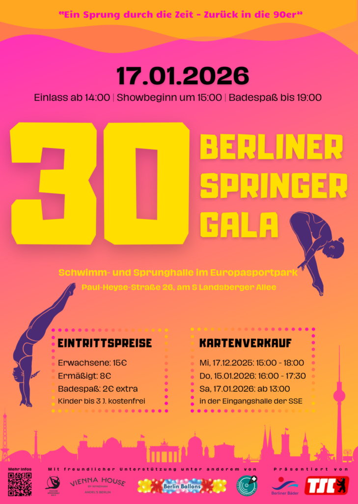 Am 17. Januar 2026 feiern wir ein besonderes Jubiläum: 30 Jahre Berliner Springergala. Unter dem Motto „Ein Sprung durch die Zeit – Zurück in die 90er“ erwartet unsere Gäste eine außergewöhnliche Mischung aus Sport, Show und Nostalgie. Freuen Sie sich auf emotionale Momente, überraschende Acts und eine Gala, die die Leidenschaft für das Wasserspringen in all ihren Facetten sichtbar macht.
